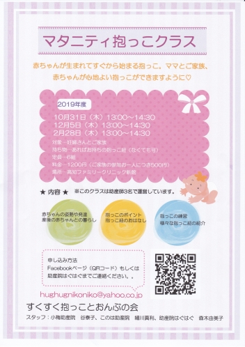 ご希望の方はFBページ「すくすく抱っことおんぶの会」にメッセージをいただくか、hughugnikoniko@yahoo.co.jp(助産院はぐはぐ、森木助産師)へご連絡ください。